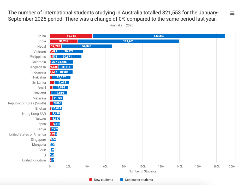 ✅ A Austrália recebeu mais de 821 mil estudantes internacionais em 2025. (Fonte: Australian Government, Dept. of Education)