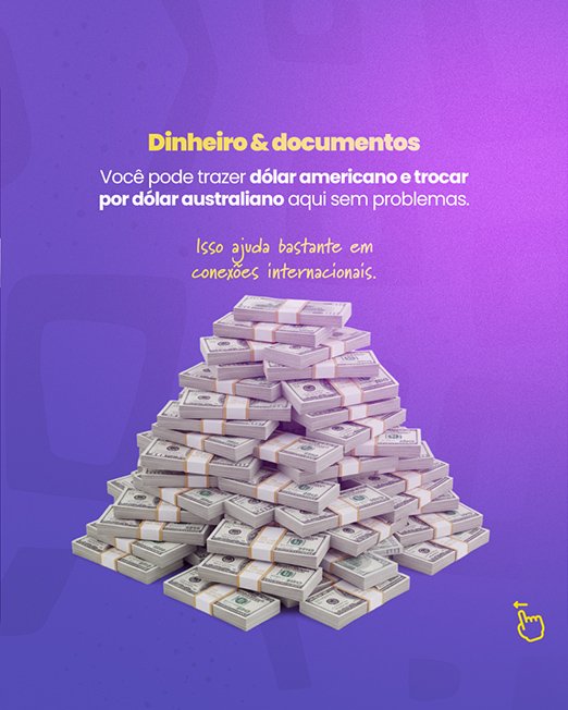 Dica CF: Você pode trazer dólar americano e trocar por dólar australiano aqui sem problemas. Isso pode ser útil durante conexões em outros aeroportos internacionais.